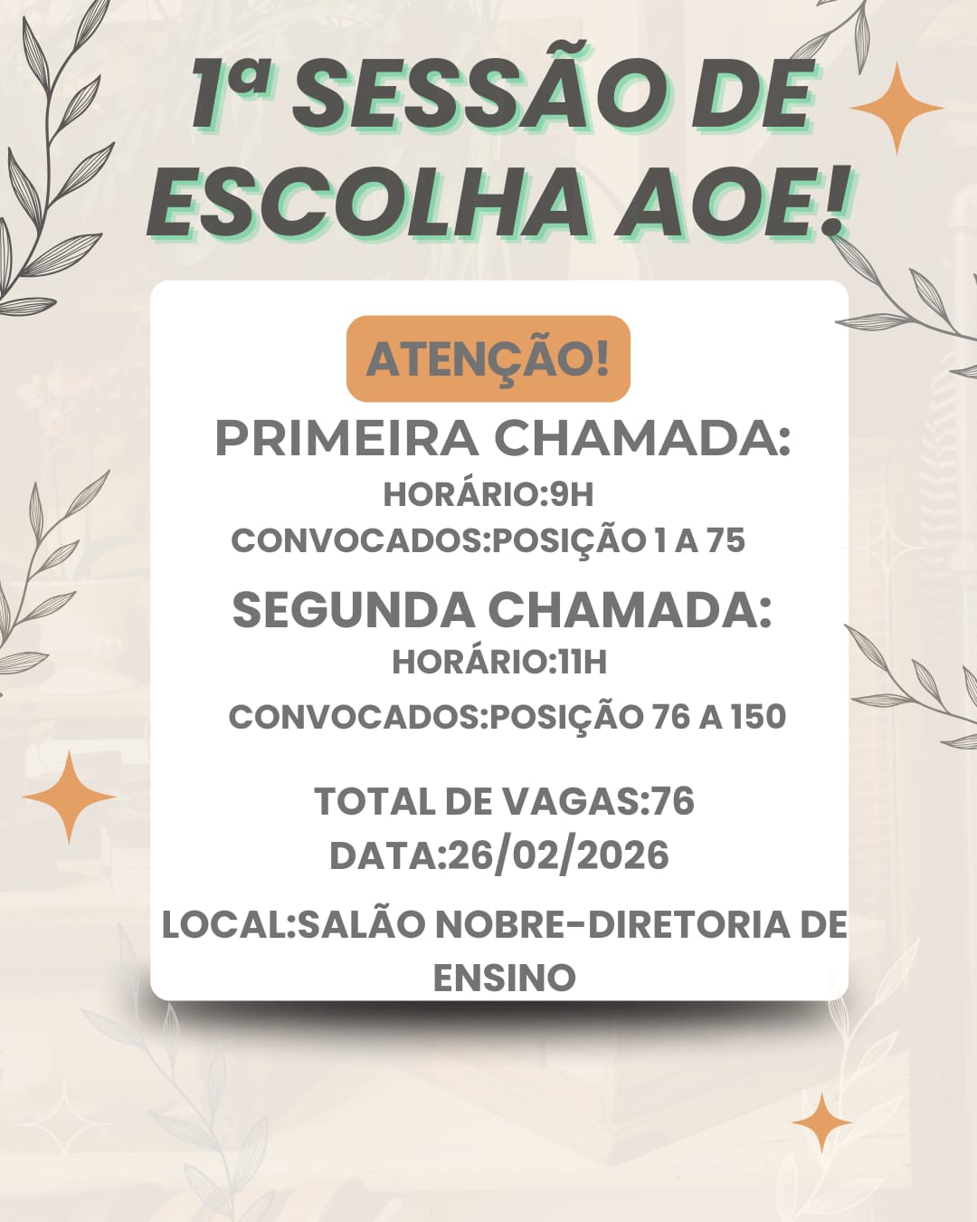 1ª Sessão de Escolha AOE 13-02-2613 de fevereiro de 2026 Enviar por e-mail LEIA TAMBÉM Editais 2026 GABARITO REFERENTE A PROVA DE 14/12/2025 – PSS AGENTE ORGANIZAÇÃO ESCOLAR Credenciamento URE – CEL 2026